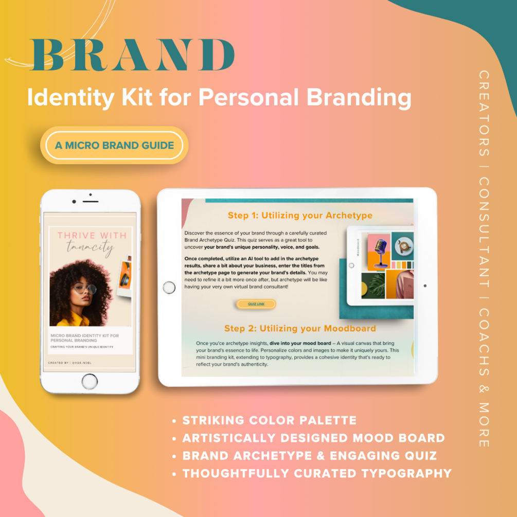 Create an unforgettable brand identity with our all-inclusive package. This kit reflects a world of vibrant emotions with a beautiful color palette and a thoughtfully designed mood board. Discover your brand archetype through an engaging quiz and ensure a consistent and captivating brand voice with meticulously curated typography. Elevate your brand presence with a package that seamlessly blends creativity, authenticity, and cohesion, telling your unique story in a way that leaves a lasting impression.